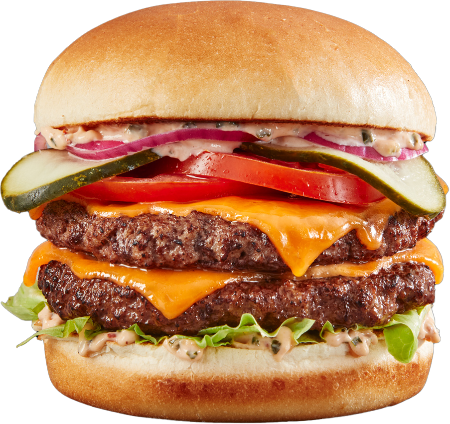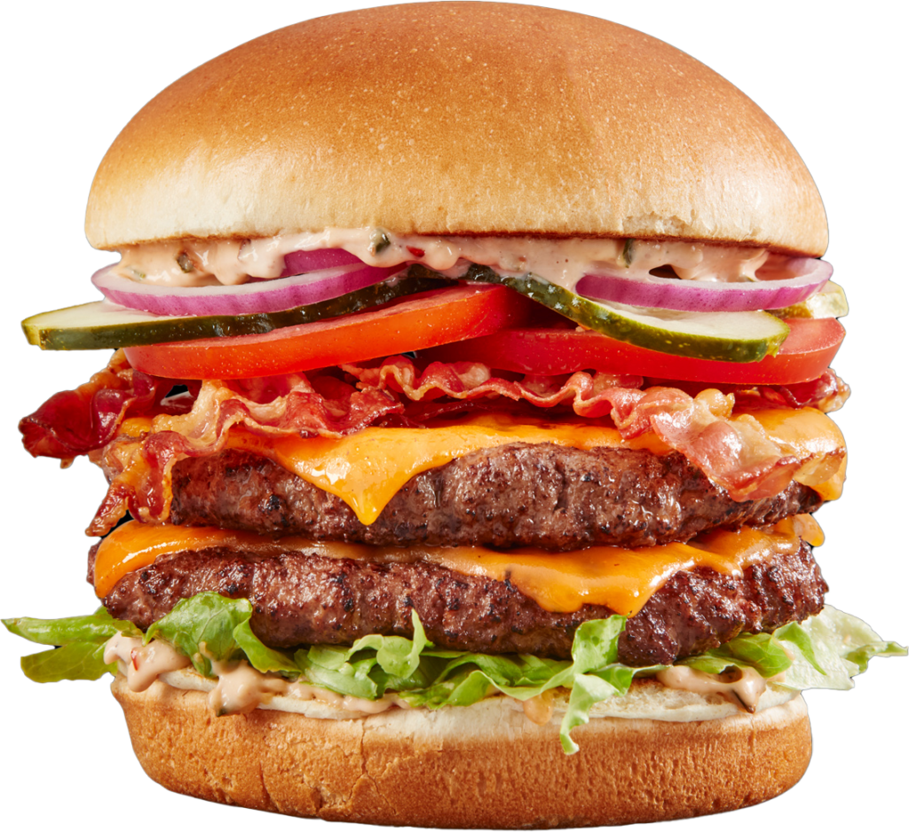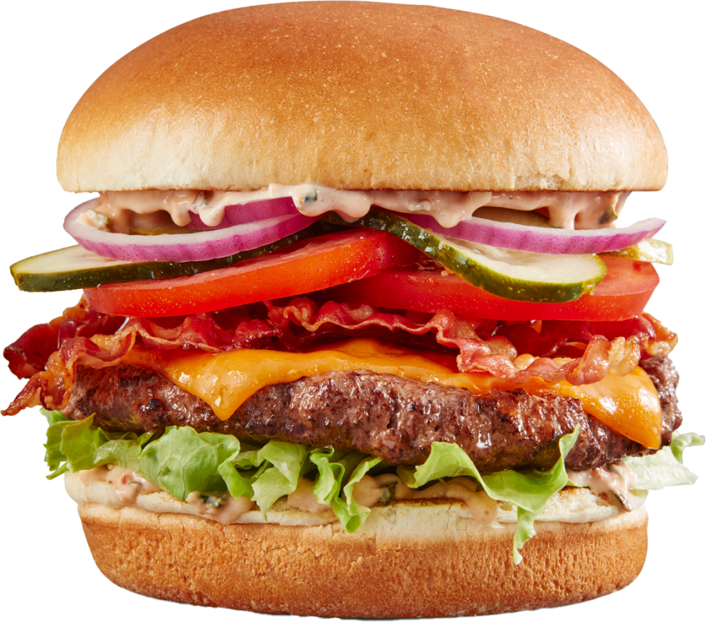 Crispy Bacon, American Cheddar, Lettuce, Tomatoes, Onions, Pickles, Signature Sauce, and choose from over 30+ free toppings to make your own creation.